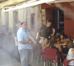 En été, beaucoup de terrasses en plein air sont souvent trop chaudes. Avec la brumisation, on abaisse la température de 10 º C; les clients profitent d'un air plus sain et frais; on peut aussi stopper les pollens, les insectes et les odeurs, etc....... En savoir plus